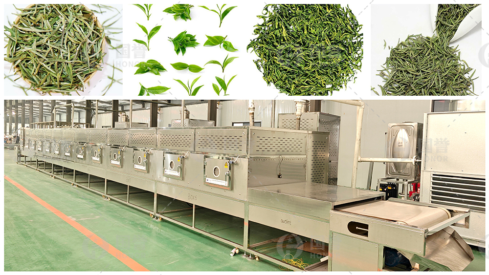 茶叶杀青应用-生产绿茶、乌龙茶,均需要加热杀青处理,以钝化多酚氧化酶的活性,蒸发部分水分,挥发青草气味,软化组织。针对绿茶,传统接触式滚筒炒锅杀青,技术要求高,易出现杀青不透,红耿红叶,焦边问题,香味口感尚可。微波杀青,可以做到三绿(茶色、汤色、叶底),配合炒二青,对香气和滋味有很大提升作用。