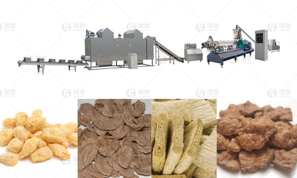 组织蛋白:主要采用单螺杆挤压蒸煮机,以普通的食用豆粕为原料,通过挤压、剪切、高温瞬时处理,使蛋白质发生变性并形成层状或网状结构。