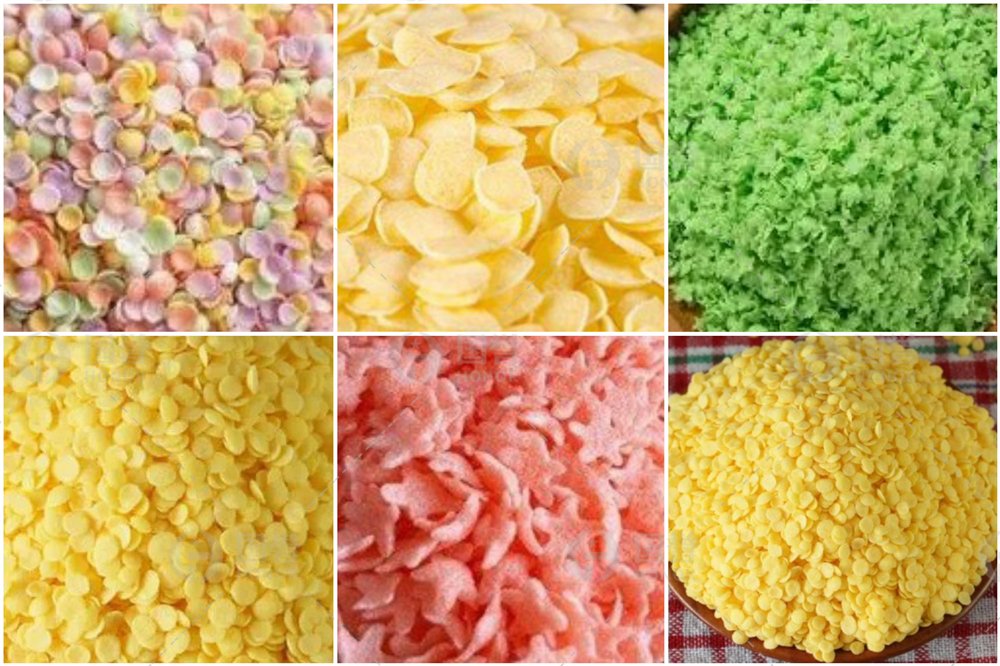 2. 挤压膨化成型:这是整个生产线的“心脏”。混合好的原料被送入双螺杆膨化机,在精准控制的温度、压力和湿度下,物料发生复杂的物理化学变化,从模头挤出并瞬间膨化成型。模具的设计直接决定了产品是雪花片状还是颗粒状。