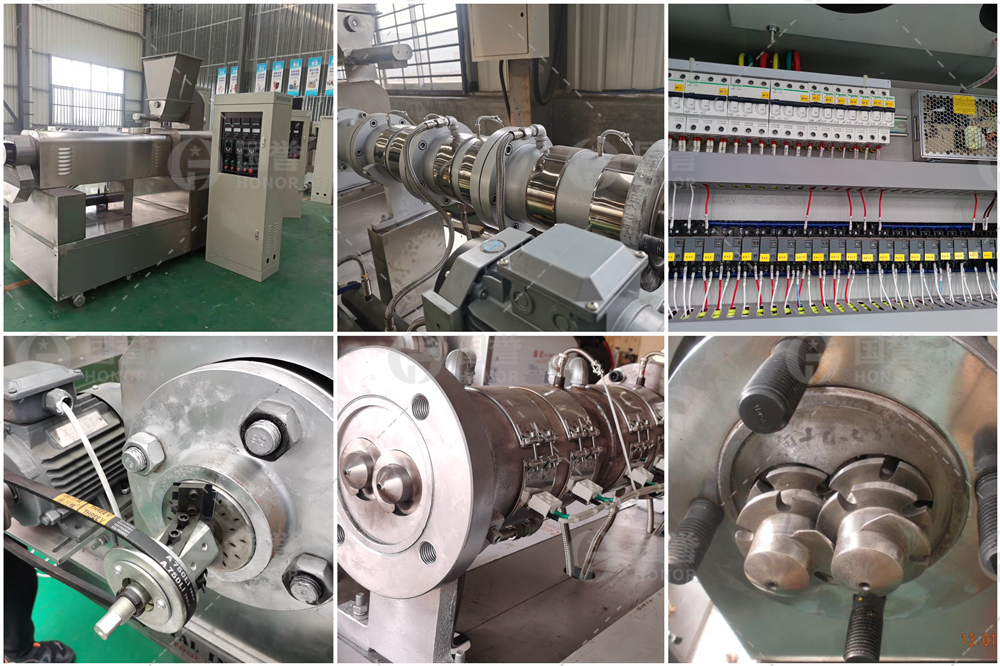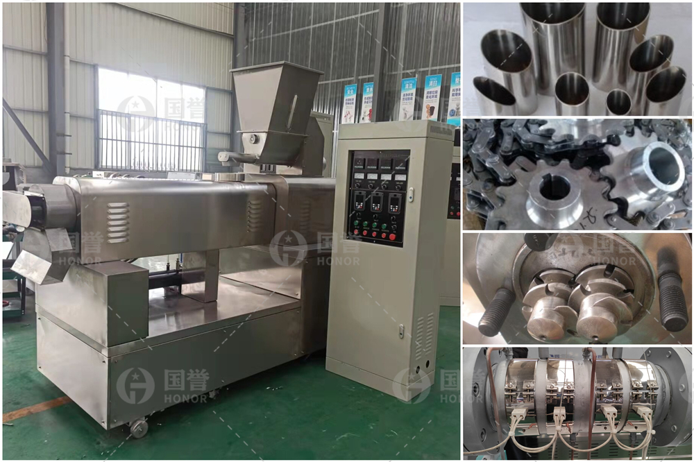 综上所述,双螺杆挤压膨化机的工作原理简洁高效——通过输送混合、加热熔融和瞬间膨化三个步骤,将谷物原料转化为疏松多孔的膨化食品。