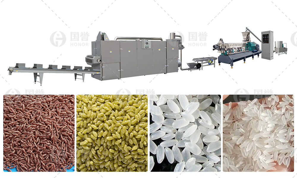 营养大米/强化大米/人造大米食品生产线以大米,小米,黑米,荞麦以及各种玉米和谷物粉为原料,螺杆挤出机将原料制成大米形状,并在干燥机中将其干燥至所需的水分含量。挤压技术可以增强和固化水稻中的微量营养素。然后使用冷却传送带,烘干机等制成可以出售的营养大米。将维生素,蛋白质和矿物质成分混合,通过挤压机制作成大米。